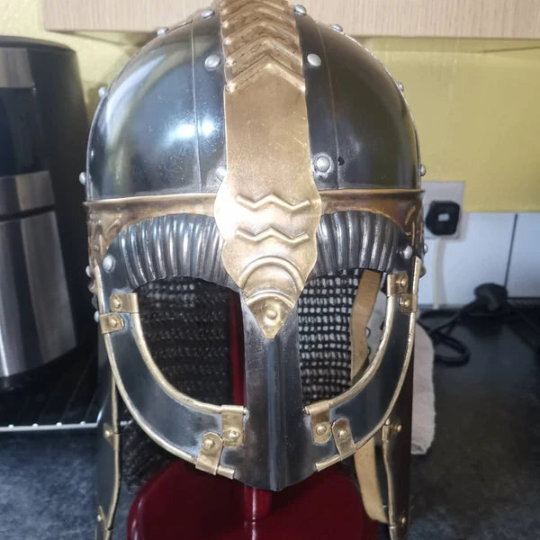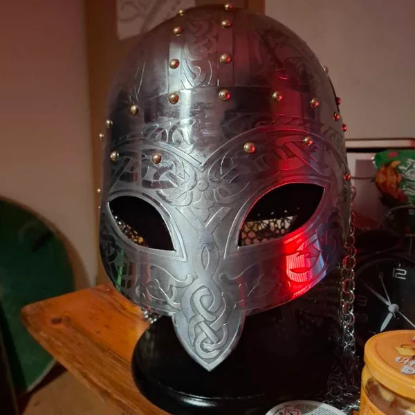 Medieval Viking Etched Steel Helmet with Chainmail – Vendel Era Armor Replica
